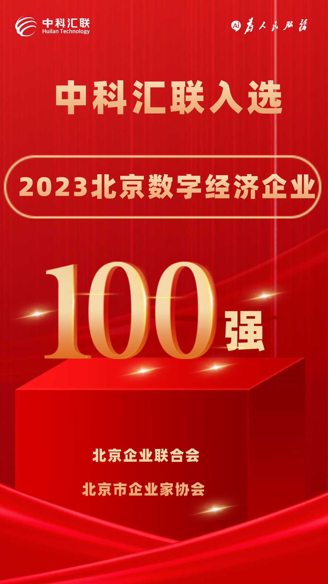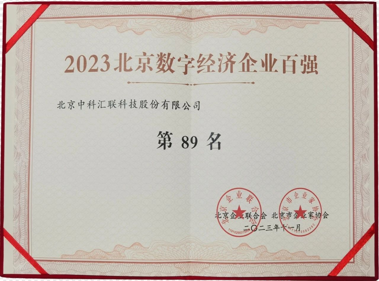 11月30日,由中国企业联合会、中国企业家协会指导,北京企业联合会、北京市企业家协会主办的“2023京津冀产业链供应链大会暨京津冀百强企业、北京百强企业高峰论坛”在北京召开。会议发布北京企业100强榜单及《北京企业100强发展报告》,中科汇联凭借在数字经济领域出色的综合实力、技术水平和业务影响力,与京东、贝壳控股、软通动力、紫光股份、蓝色光标等数字化转型赋能企业一并入选2023数字经济企业100强榜单。